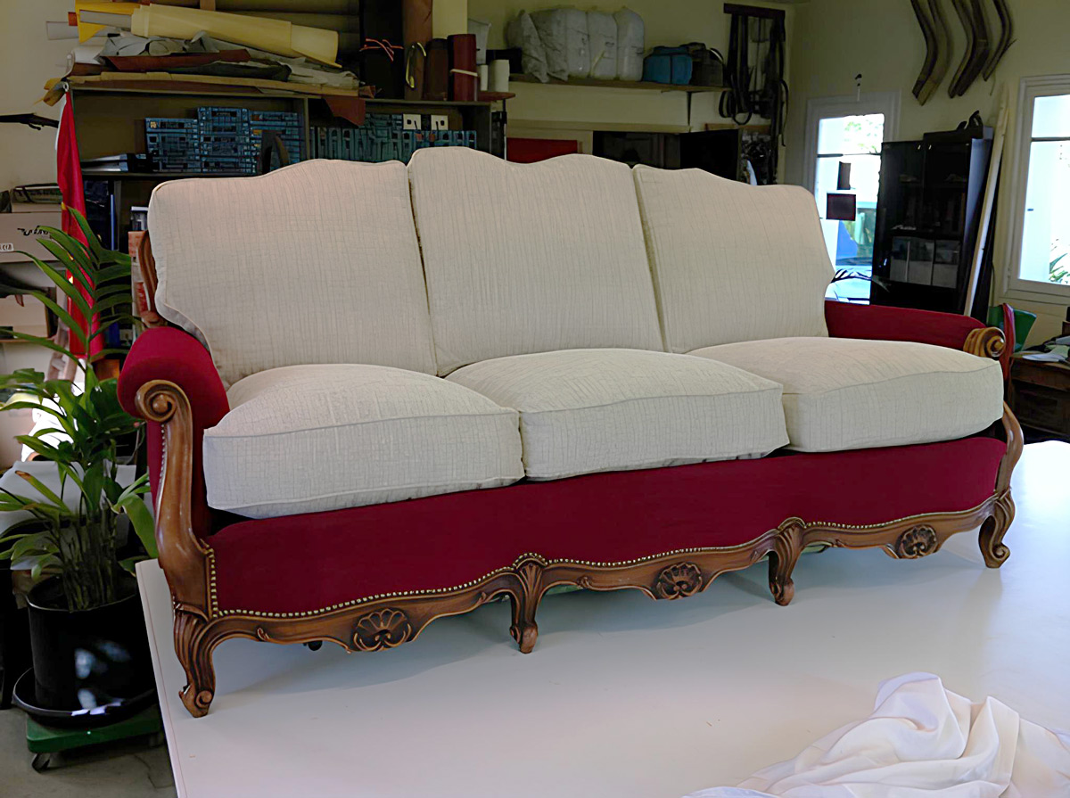 Je confectionne les sièges, les restaure ou les construis. Pour les réparations, je découpe selon les mesures relevées, le tissu choisi et le fixe ensuite sur le squelette du siège en question.