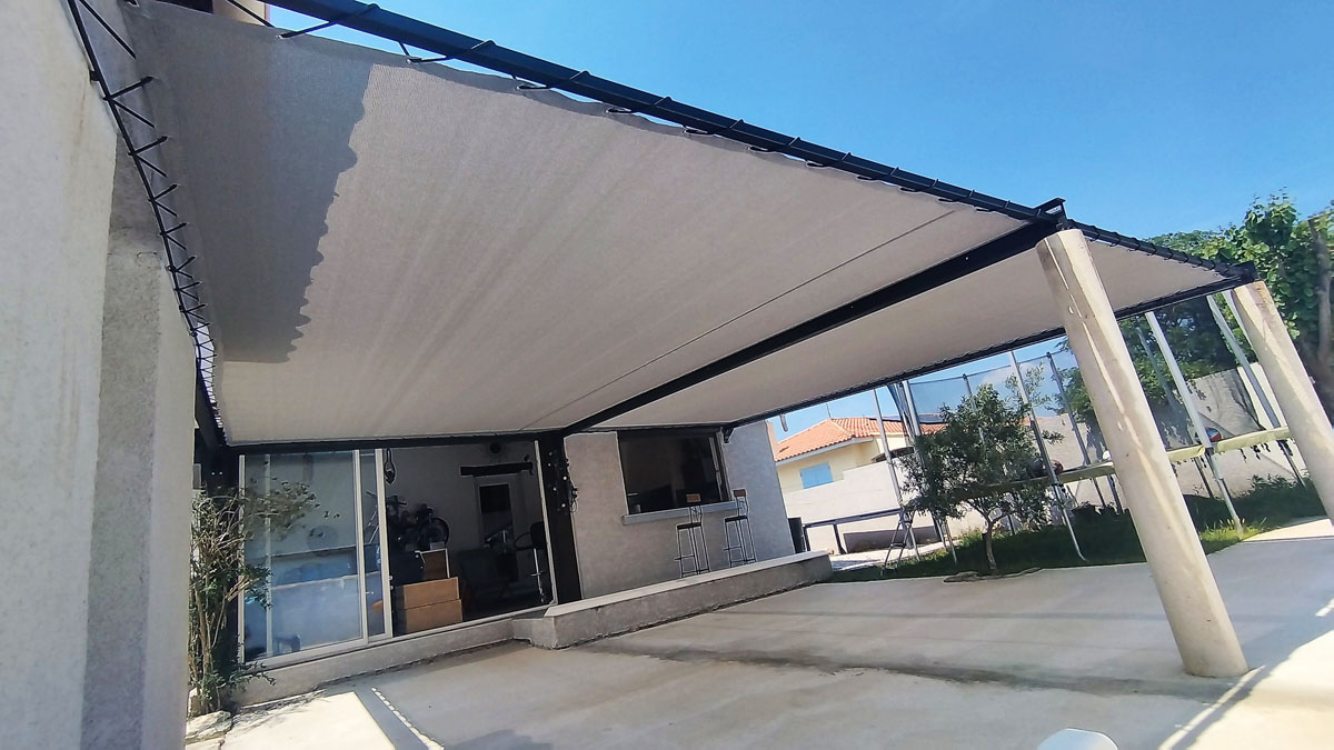 Une toile d'ombrage parfaite pour travailler tout en étant protégé du soleil mordant au Domaine de Cambis à Berlou (Hérault, 34)